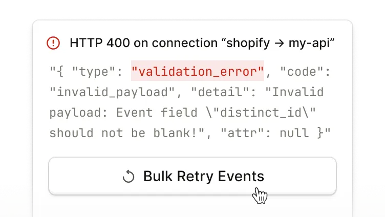 Automatically surface failed events, inspect metadata, and replay them with confidence, no custom tooling needed.